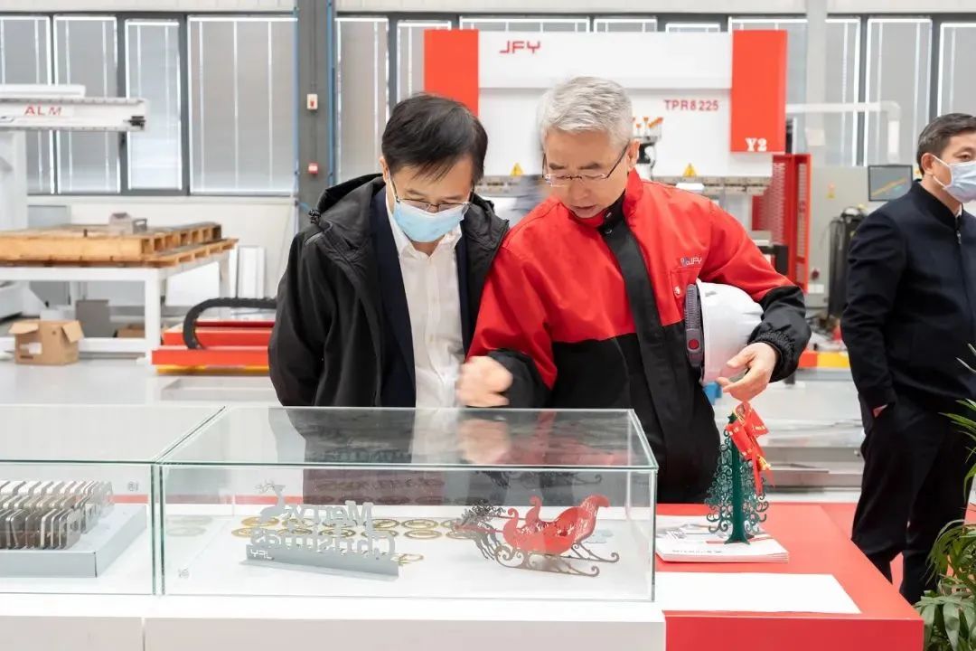 随后一行人又观摩了金方圆公司展厅,这里陈列着金方圆主营的各类机床和自动化生产线,展柜中的精美工件正是通过这一台台机床、一道道工序才得以完美呈现。