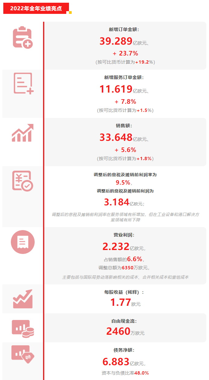 以下数字是科尼集团2022年财务报表的摘要。请点击文末“阅读原文”登录科尼网站查阅完整报告。本报告中提供的数字未经审计。除特别注明外,指上年同期。