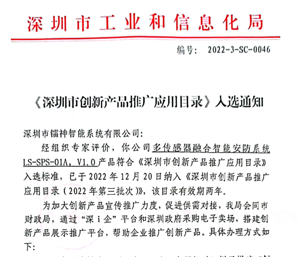 近期,深圳市工业和信息化局(以下简称深圳市工信局)公布的《深圳市创新产品推广应用目录(2022年第三批)》中, 镭神智能多传感器融合智能安防系统成功入选。