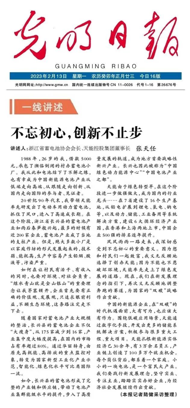 近日,《光明日报》“一线讲述”栏目刊发《不忘初心,创新不止步》文章,采访了天能控股集团董事长张天任。报道讲述了在张天任董事长带领下,天能积极响应国家“双碳”战略,扎根新能源实体经济,围绕低碳应用场景,通过数字化手段,不断加快转型升级和技术攻关,努力实现高质量发展。一起来看报道!