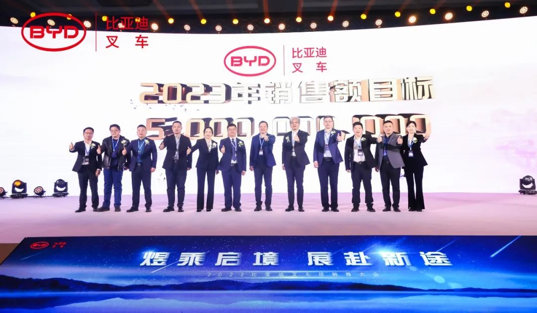 忆往昔我们踌躇满志,展未来我们豪情满怀,在回顾2022年成果的同时,比亚迪叉车也在大会上公布了新一年的目标。比亚迪叉车也将继续坚持技术创新,致力于打造完备的物流搬运解决方案,全面助力绿色物流发展。