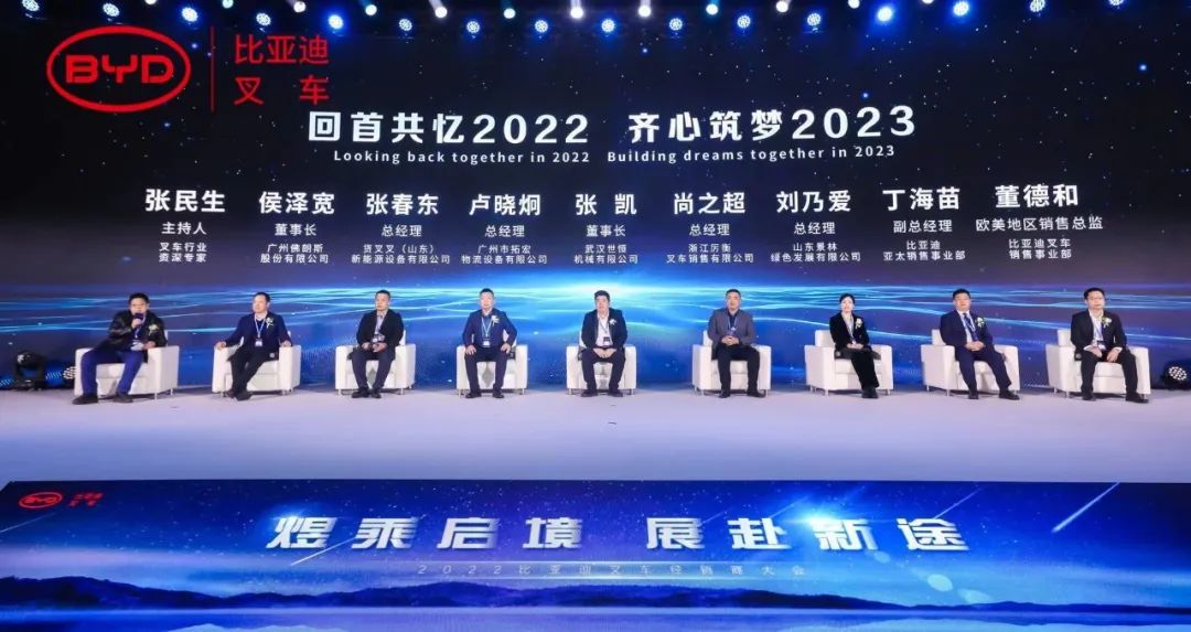与此同时,本次会议设置了“回首共忆2022,齐心筑梦2023”的交流环节,由叉车行业资深专家张先生主持,同时邀请了6位经销商代表、及比亚迪内部相关管理人员,在现场相继发表了自己的观点与想法,并展望了新能源叉车发展的未来蓝图。精彩的分享与交流,引得台下阵阵掌声,也让大家受益匪浅。