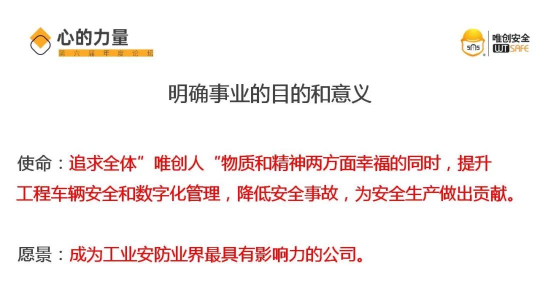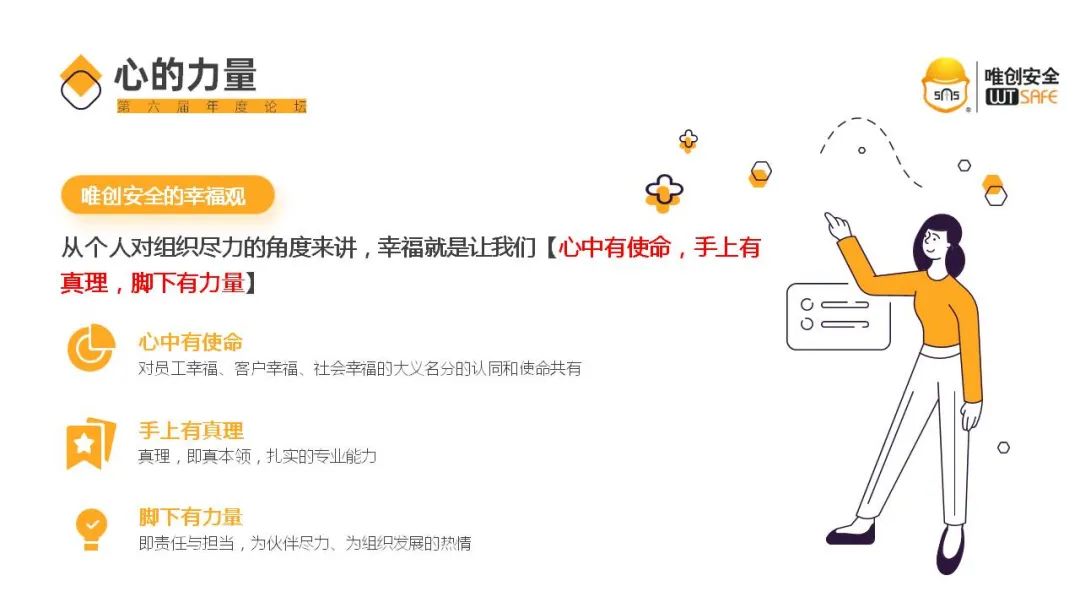 而追求全体“唯创人”物质和精神两方面幸福是这一切的起点。为此我们要清晰定义唯创安全的幸福观,唯创安全的员工幸福体系。从组织对个人发展的角度来讲,幸福就是【给你爱,带你奋斗,成为专家】!