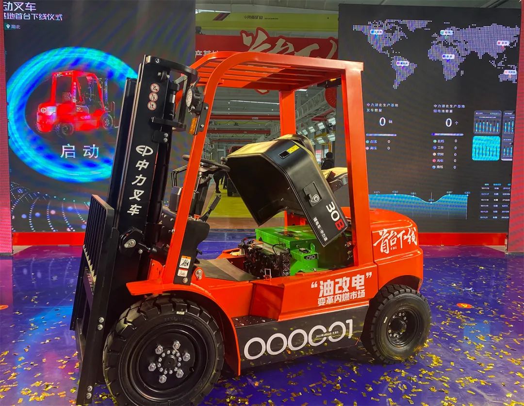 湖北中力机械的第一台电动平衡重叉车ICE302B2顺利下线