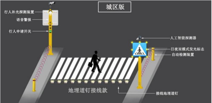 基于原本车路协同系统,将智能探测系统连通斑马线上的道钉灯,行人路过时会触发道钉灯快闪并开启安全语音提醒,夜间的道钉灯会随着红绿灯状态而改变颜色,闯红灯行为也会触发抓拍、道钉灯快闪以及语音报警。智慧斑马线更好的保障行人在通过路口时的人身安全,同时也能提醒路口的车辆注意避让行人。