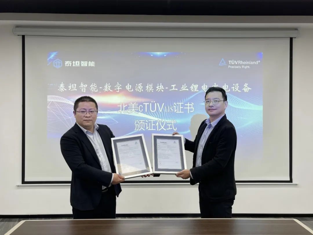 2月28日,德国莱茵TÜV大中华区(以下简称“TÜV莱茵”)为广东泰坦智能动力有限公司(以下简称“泰坦智能动力”)的工业锂电充电设备颁发了cTUVus标志的北美证书,标志着泰坦智能动力工业充电设备符合了美国职业安全与健康管理局OHSA的NRTL认可要求,可以为北美市场提供高可靠的工业充电设备。广东泰坦智能动力有限公司董事长邹建俊、常务副总经理陈健斌、副总经理李建华、营销总监许有杰;TÜV莱茵大中华区太阳能及商业产品服务电力电子产品副总经理陈雄、销售经理赵启豪、销售主管尹林玲等双方代表出席本次颁证仪式。