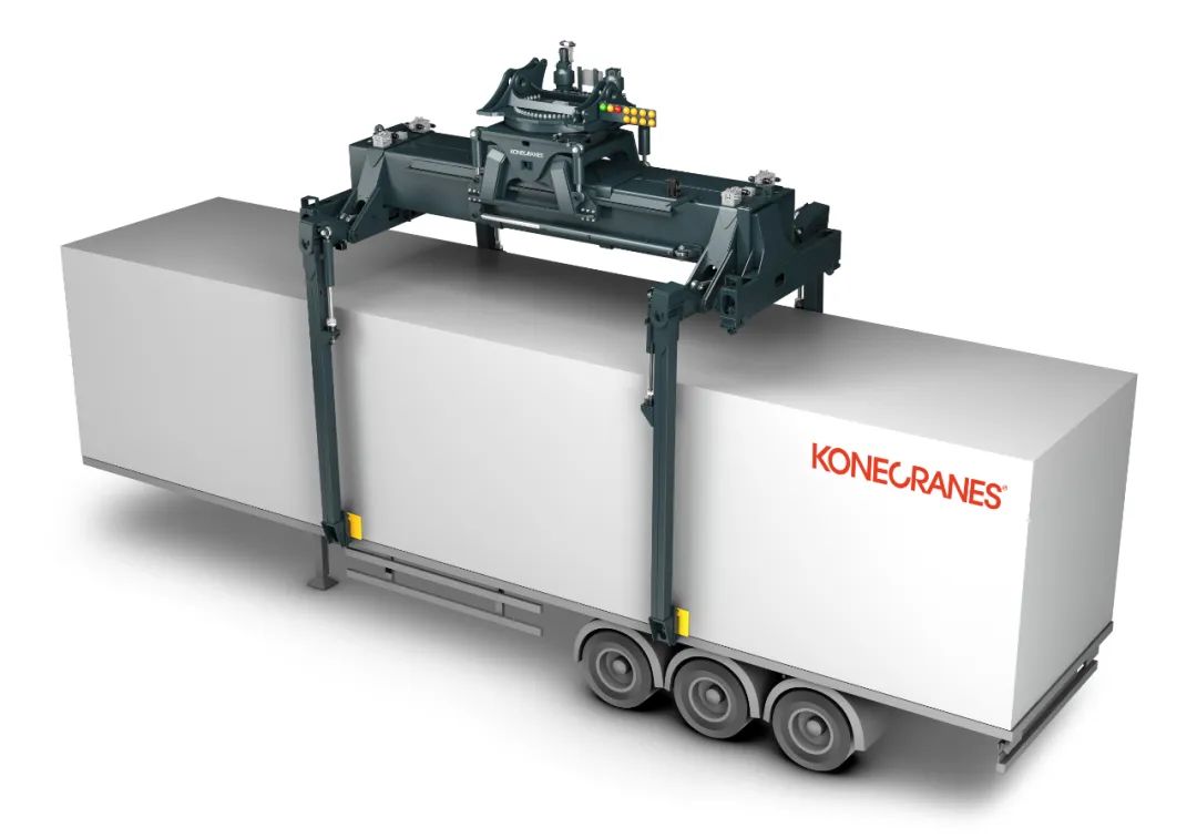 科尼发布的另一项更新,是一款更加坚固的用于多式联运的新型组合吊具,该吊具配置了超高支腿,可吊装ISO集装箱、非标货柜、平板车、拖车等,在进行搬运作业时,每排起升能力可以增加1吨。