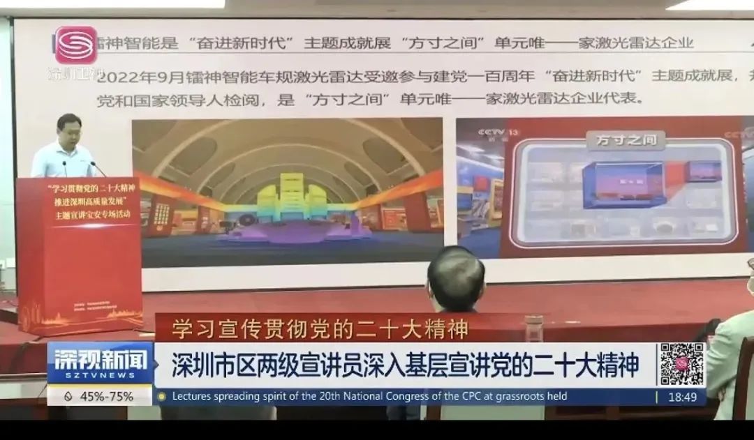 2023年2月28日下午,“学习贯彻党的二十大精神 推进深圳高质量发展”主题宣讲宝安专场活动举行。深圳市镭神智能系统有限公司董事长、CEO胡小波作为宣讲员之一,作了一篇题为《攻克“卡脖子”难题,赋能高质量发展》的宣讲,并获深圳特区报、深视新闻报道。