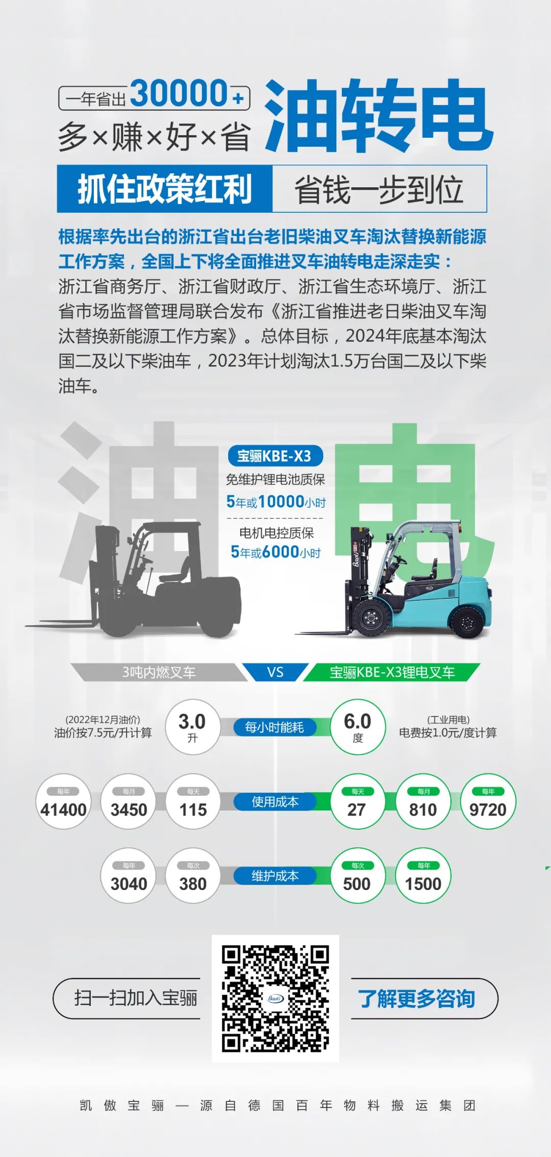“油转电”再迎政策春风,浙江省率先出台老旧柴油叉车淘汰替换新能源工作方案,全国上下将全面推进叉车油转电走深走实。