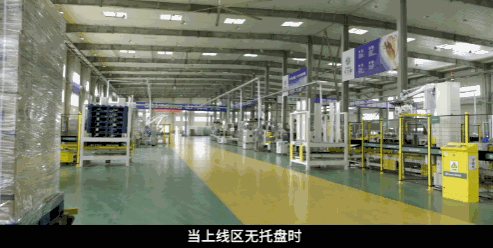 当上线区无可用托盘时,托盘机便会发出信号,这时AGV会在短时间内完成自动响应,将托盘缓存区的托盘取至托盘机上。