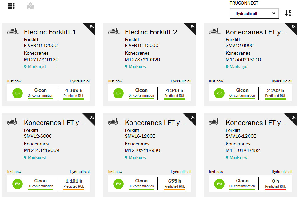 在yourKONECRANES.com中,您可以非常直观的体验到TRUCONNECT®Premium+的优势,根本无需油样分析,一眼就能看出液压油能否继续使用(绿色)、是否需要观察(橙色)或要立刻进行更换(红色)。这将为您大幅提升液压油的使用效率,延长相应的维保间隔并减少废油处理的成本,从而降低整体的环境影响。