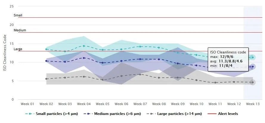 升级后,您可以在yourKONECRANES.com上的 TRUCONNECT®报告看到液压油中的颗粒物(ISO 4406)和水含量。如下图所示,传感器可以监测到不同大小的颗粒物,并在颗粒物大小及含量超过警戒线时发出预警,这一点非常重要,因为液压油中的污染会导致液压系统出现许多问题,例如过滤器堵塞、部件加速磨损、金属表面腐蚀、生锈和化合物形成、粘度变化等。