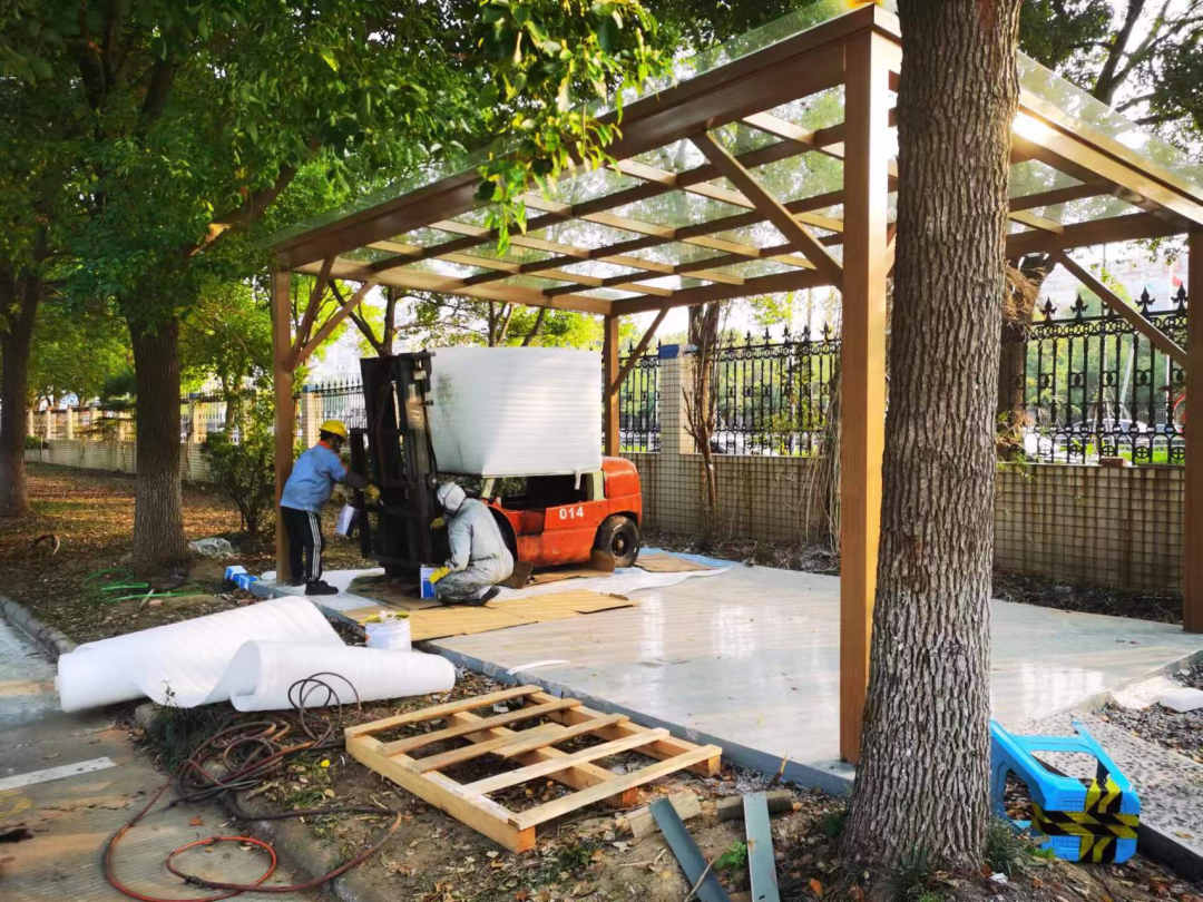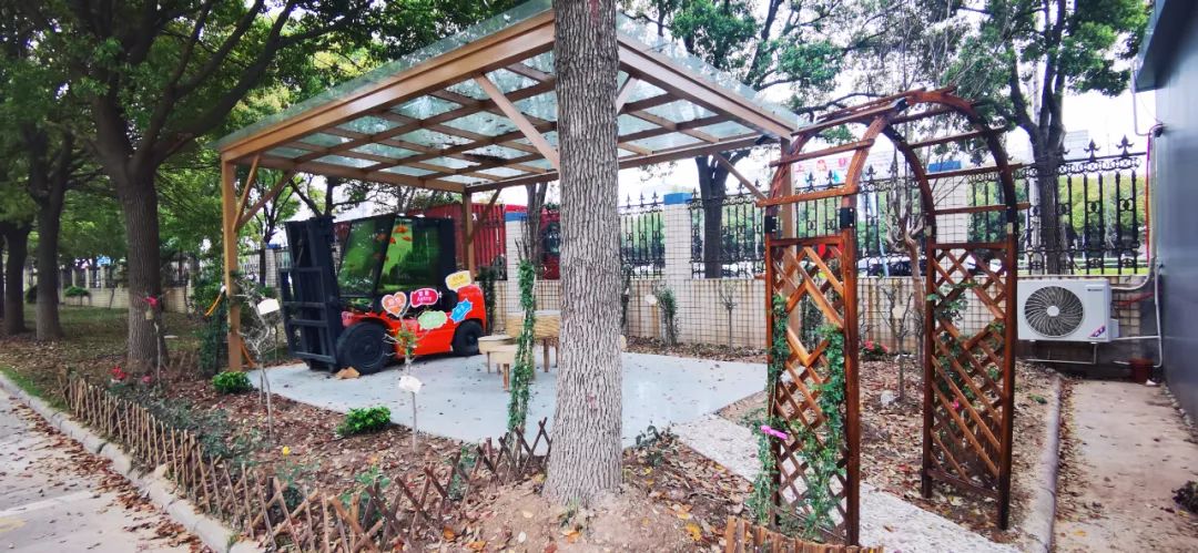 在凯傲靖江工厂,宝骊的同事们也把一台报废的宝骊叉车改造成了一个叉车水族箱,甚至还将创意进行了放大和延伸。他们把叉车水族箱摆放在了公司入口右侧的小凉亭里,在凉亭周边种上了树和花草。原来单调的空地变成了生机盎然的休闲区。很多员工在休息时间都会来这里看看鱼、赏赏花,放松一下身心。
