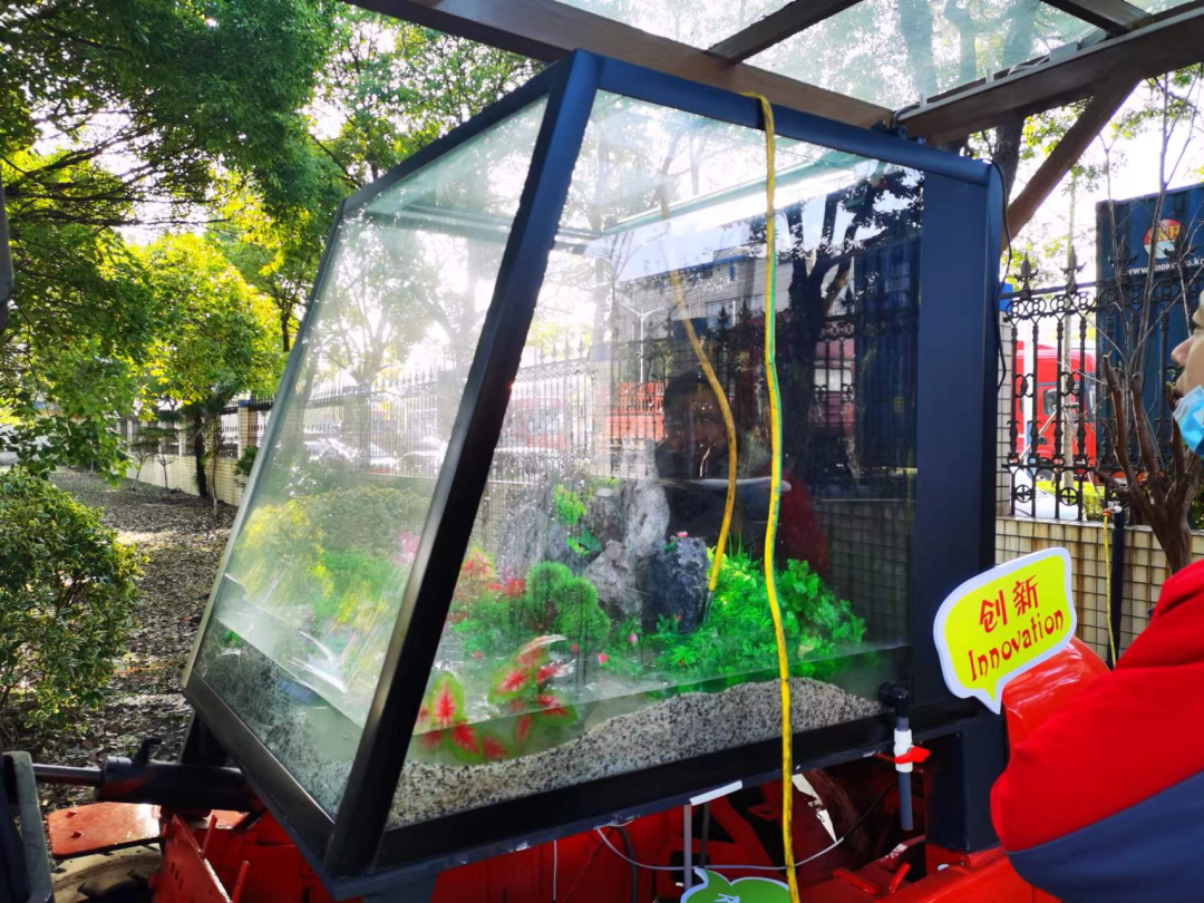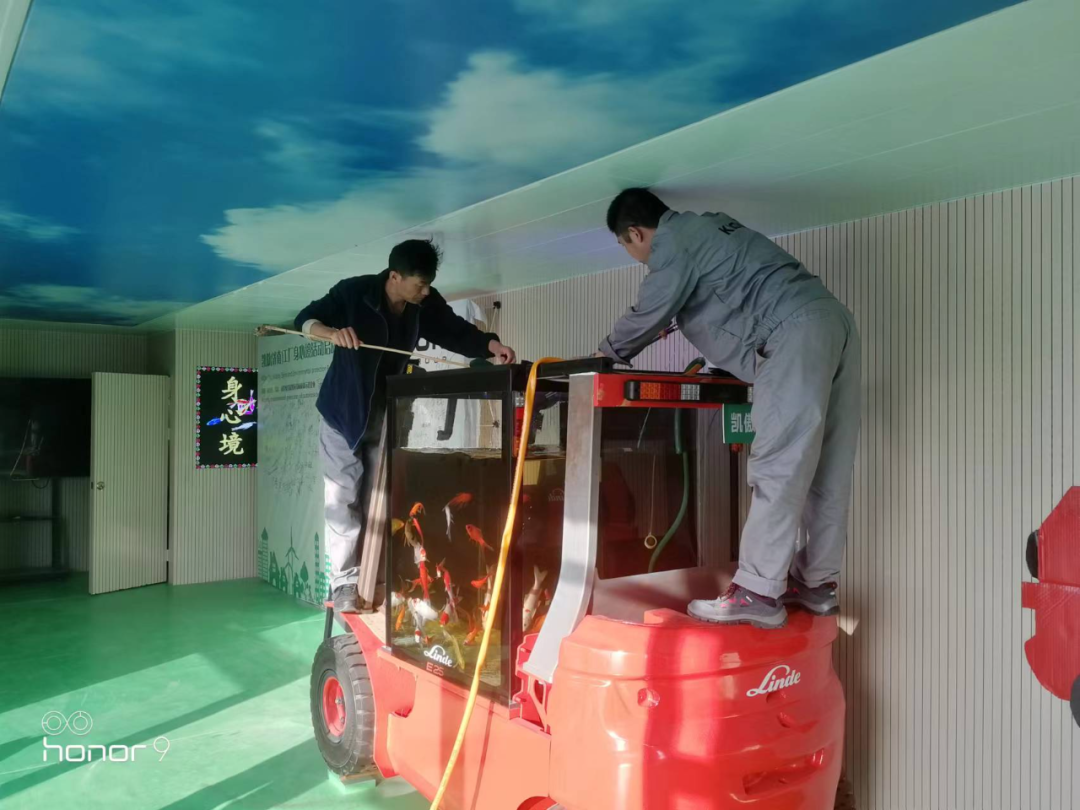 值得一提的是,这些叉车水族箱平时的维护保养都是由凯傲的员工志愿者们自愿承担的。他们轮流负责喂鱼、换水、清洁水族箱。这个过程也很环保:换下来的水用来浇树,鱼肥也可以用来滋养植物和树木。