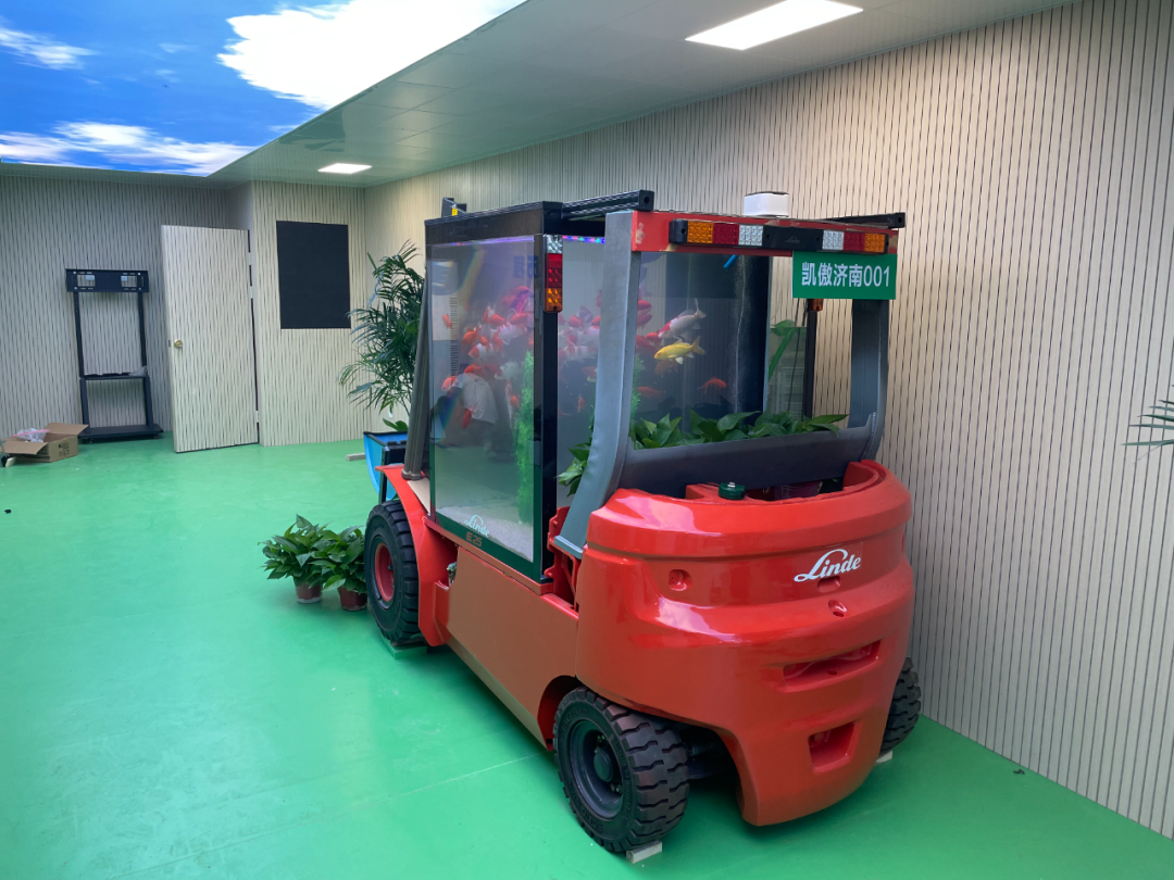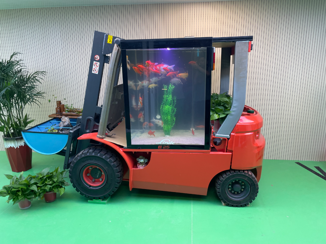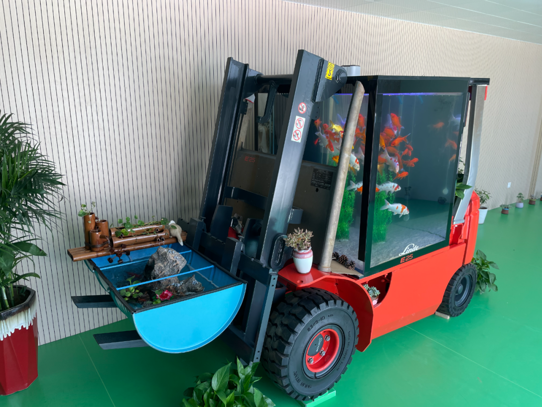 在现代化的凯傲济南工厂办公楼入口处,一台叉车水族箱已经成为了亮点,员工和访客都会驻足欣赏拍照。这个水族箱是济南工厂的同事们用废旧的叉车改造的。门架来自宝骊,车架和部件来自一台报废的林德试验车—和济南工厂一样,完美结合了两个品牌。鱼缸是单独制作好后嵌入叉车驾驶室的,而这一听起来很容易的任务恰恰是最困难、最具挑战性的,因为鱼缸的尺寸和重量必须完全符合叉车驾驶室的尺寸和承重。为此,生产部门的同事和研发部门的同事利用下班时间研究设计方案、反复修改,一个多月后,叉车水族箱终于做好了!同事们还把一个废油桶改造成了一个水桶和水井,水桶上用竹子做了一个水车,再栽上绿植—整个叉车水族箱俨然成了一个流动的小小自然生态圈。