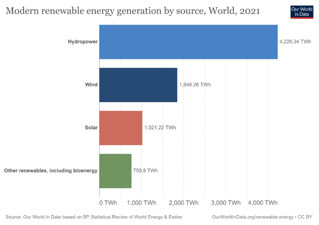 可再生能源已经占全球能源生产的很大一部分。水力发电遥遥领先,但风能和太阳能正在迅速赶上。图1显示了2021年的全球能源生产情况,说明了风能和太阳能如何获得牵引力。