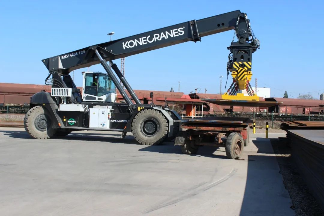 2022年3月科尼向德国享有盛誉的Sigma Weiterverarbeitungs GmbH & Co KG (Sigma)交付了一台SMV 4636 TC5正面吊,车身采用黑色涂装,配备了带有四个磁铁的的横梁(由液压控制),用于钢板搬运作业。