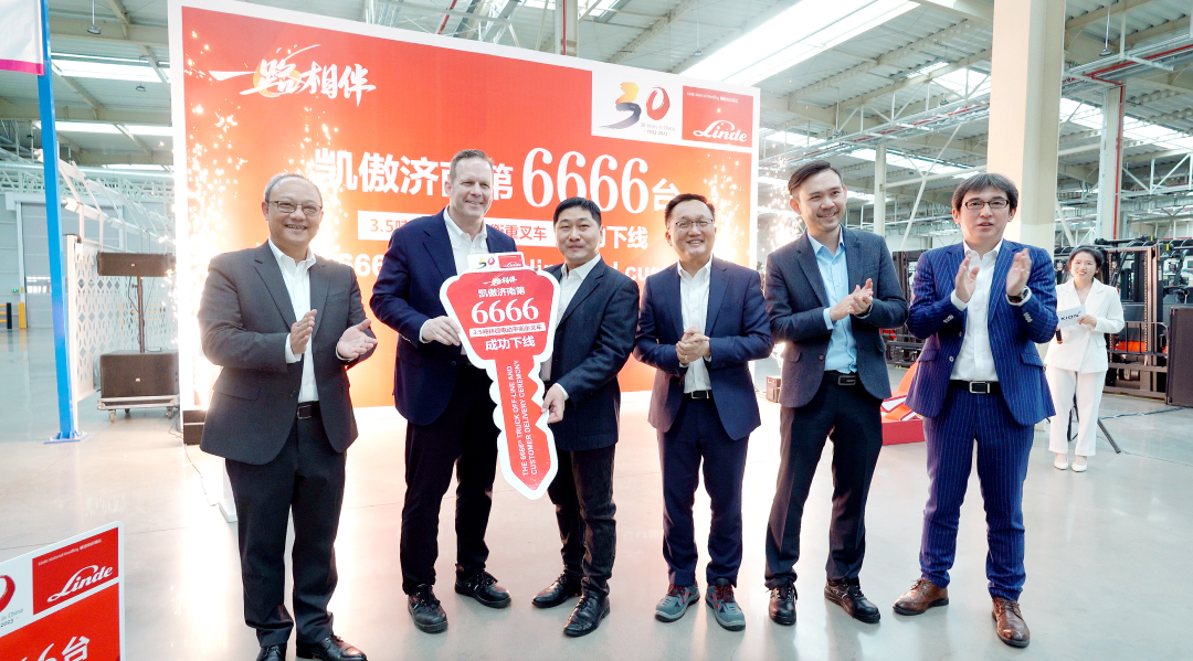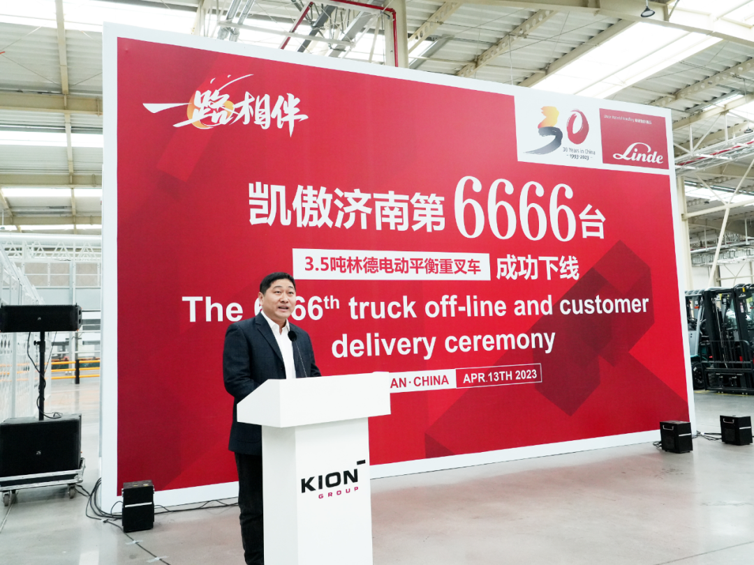 2023年4月13日,一路相伴暨凯傲济南工厂第6666台林德3.5吨电动平衡重叉车下线仪式在济南莱芜智慧工厂盛大举行。凯傲集团首席执行官Rob Smith、凯傲集团董事兼凯傲亚太及美洲区总裁郭进鹏、凯傲集团执行董事会成员以及凯傲中国管理层、海尔集团客户方代表、媒体嘉宾等出席本次活动,共同见证这历史性时刻。∨