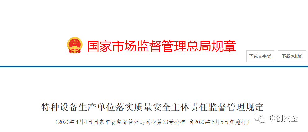 2023年4月4日国家市场监督管理总局发布了《特种设备生产单位落实质量安全主体责任监督管理规定》和《特种设备使用单位落实使用安全主体责任监督管理规定》,即总局令第73号、第74号。