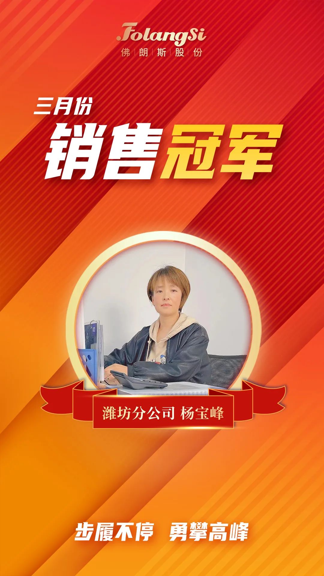 如果你亲眼见到杨宝峰,你很难想象这么一个娇小的女子竟藏着如此巨大的能量。2022年10月,杨宝峰怀着憧憬和坚定,再次加入了佛朗斯的大家庭。勤奋、坚韧、不肯懈怠的她,步履不停,做销售不到半年的她,就荣获国内事业3月销售冠军!巾帼不让须眉,她用实力证明自己。