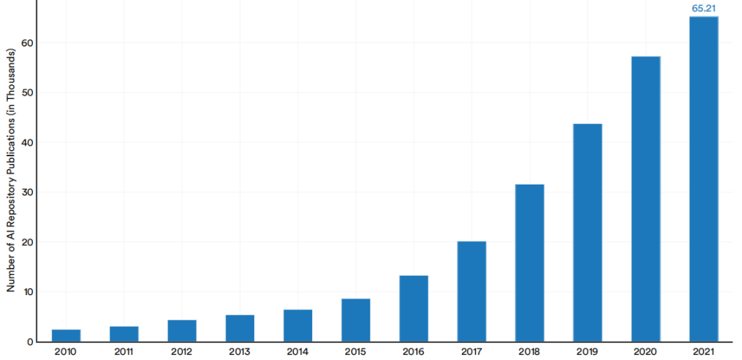 发布关于电子预印本存储库(如arXiv和SSRN)的预同行评议论文已成为人工智能研究人员在传统出版途径之外传播其工作的一种流行方式。这些存储库允许研究人员在将其提交给期刊和会议之前分享他们的发现,从而加快了信息发现的周期。在过去的12年里,人工智能存储库出版物的数量增长了近27倍(图1.1.17)。