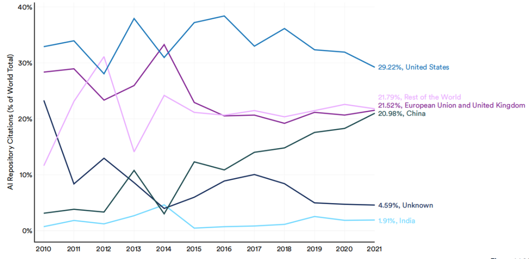 在人工智能知识库出版物的引用中,图1.1.20显示,2021年,美国以29.2%的总引用量位居榜首,保持领先于欧盟和英国(21.5%)和中国(21.0%)。