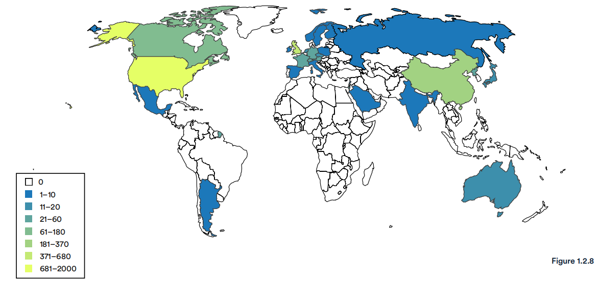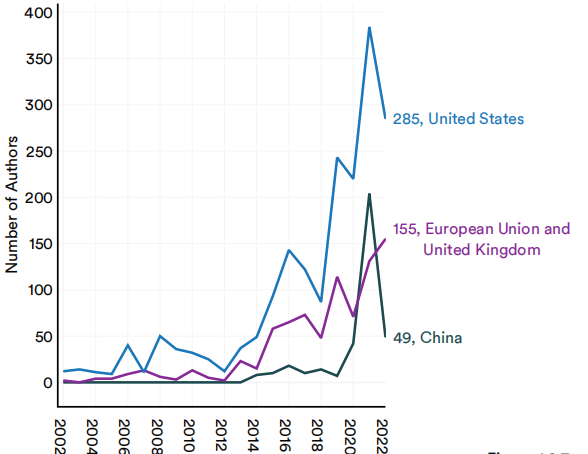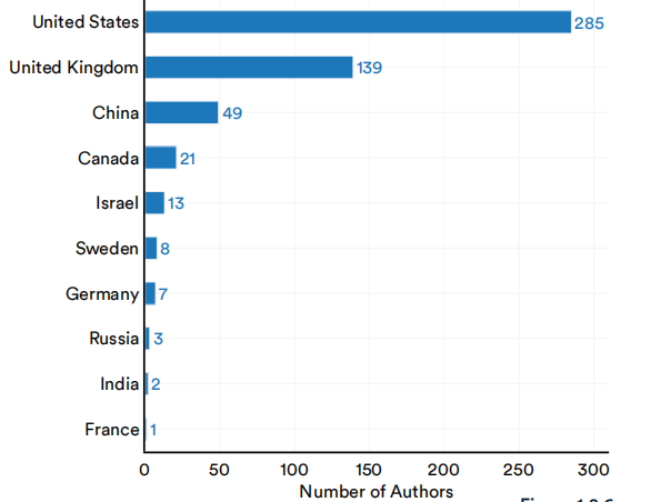 图1.2.6到1.2.8查看按国家归属关系分类的帮助启动重要机器学习系统的作者总数。就像总系统的情况一样,在2022年,美国生产重要机器学习系统的作者数量最多,有285个,是英国的两倍多,是中国的近6倍(图1.2.6)。