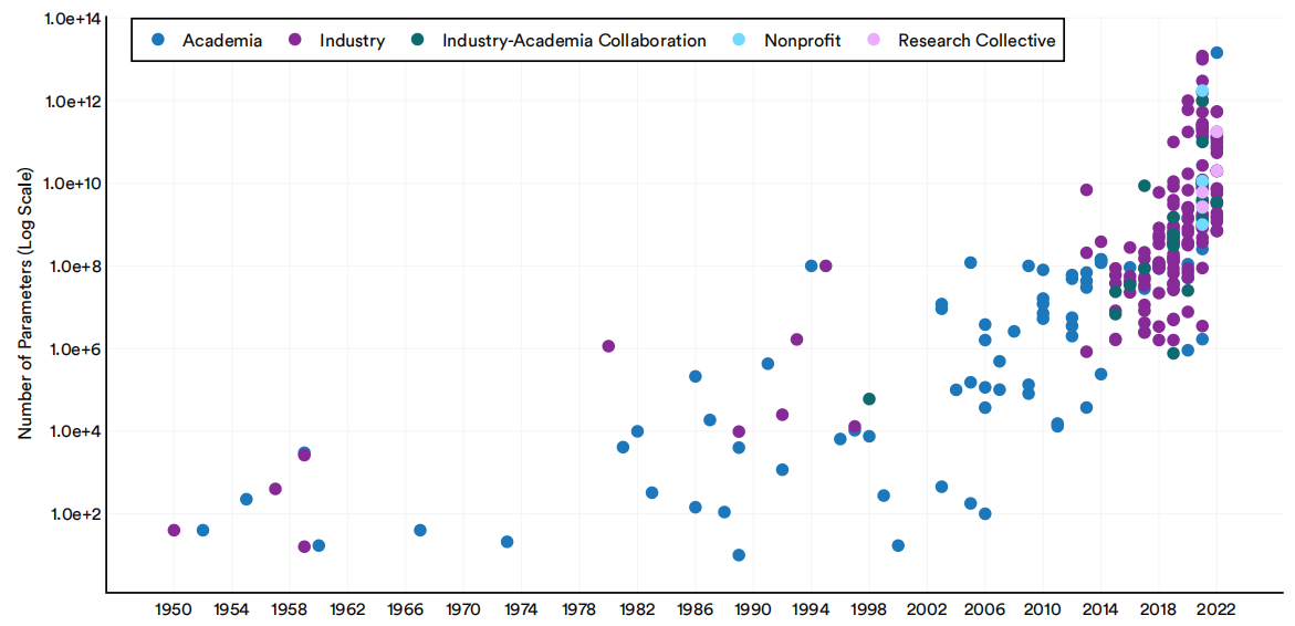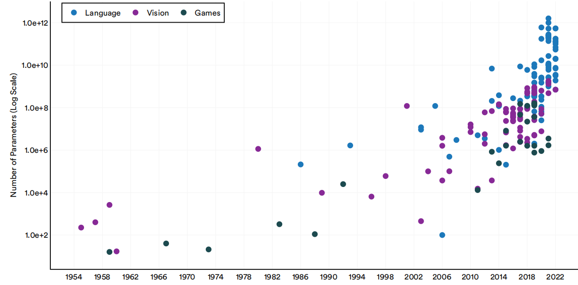 参数是由机器学习模型在训练过程中学习到的数值。机器学习模型中的参数值决定了模型如何解释输入数据并做出预测。调整参数是确保机器学习系统的性能得到优化的一个必要步骤。图1.2.9按部门突出显示了Epoch数据集中包含的机器学习系统的参数数量。随着时间的推移,参数的数量一直在稳步增加,自2010年代初以来,这个增长尤为急剧。人工智能系统正在迅速增加其参数的事实反映了它们被要求执行的任务的复杂性增加,数据的可用性增加,底层硬件的进步,最重要的是,更大的模型的性能演示。