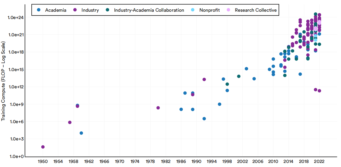 人工智能系统的计算能力,或称“计算能力”,是指训练和运行机器学习系统所需的计算资源量。通常,一个系统越复杂,所训练它的数据集越大,所需的计算量就越大。在过去的五年里,重要的人工智能机器学习系统使用的计算量呈指数级增长(图1.2.11)。对人工智能计算需求的增长有几个重要的影响。例如,更密集型计算的模型往往对环境的影响更大,而工业参与者往往比大学等其他模型更容易获得计算资源。