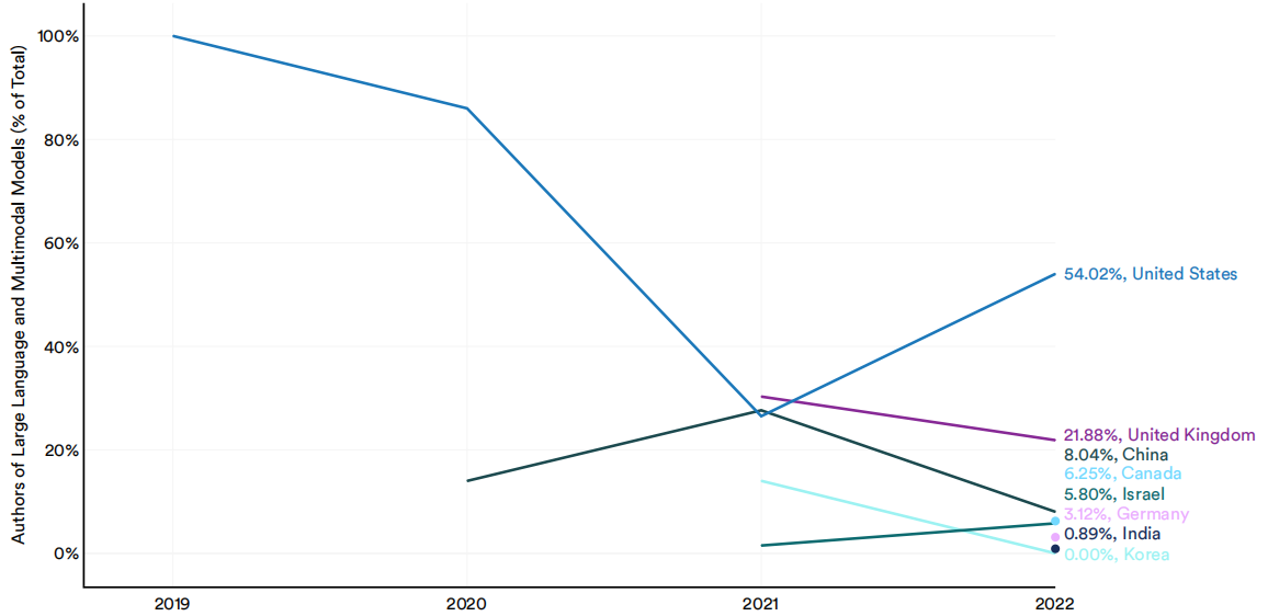 2019-22年按国家选择大型语言和多模态模型(占总数的%)的作者