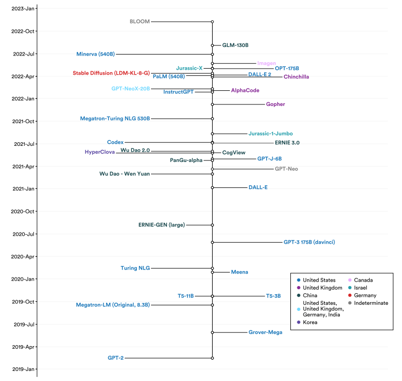 图1.2.14提供了自GPT-2以来发布的大型语言和多模态模型的时间轴视图,以及产生这些模型的研究人员的国家附属机构。2022年发布的一些著名的美国大型语言和多模态模型包括OpenAI的DALL-E 2和谷歌的PaLM(540B)。2022年发布的唯一一种中国大型语言和多模式模式是GLM-130B,这是清华大学的研究人员创建的一种令人印象深刻的双语(英语和中文)模式。同样于2022年底推出的布鲁姆计划,由于它是1000多名国际研究人员合作的结果,因此被列为不确定计划。