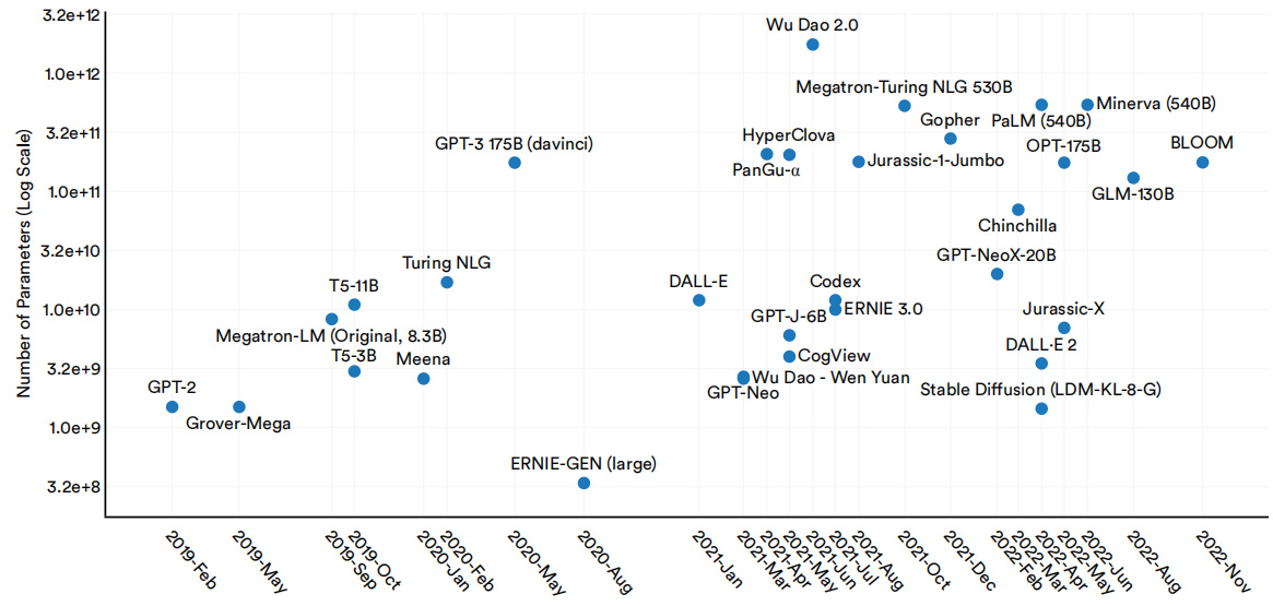 随着时间的推移,新发布的大型语言和多模态模型的参数数量大幅增加。例如,GPT-2是2019年发布的第一个大型语言和多模式模型,它只有15亿个参数。由谷歌于2022年推出的PaLM拥有5400亿美元,是GPT-2的近360倍。在大型语言和多模态模型中,参数的中位数随着时间的推移呈指数级增长(图1.2.15)。