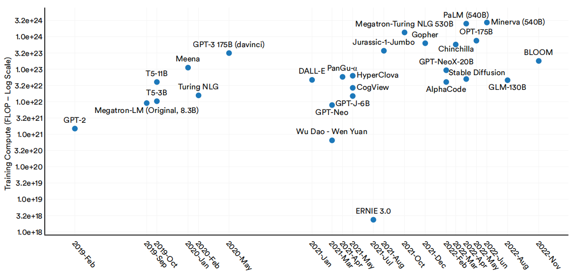 大型语言和多模态模型的训练计算量也在稳步增加(图1.2.16)。用于训练Minerva(540B)的计算量大约是OpenAI的GPT-3(2022年6月发布)的9倍,是GPT-2(2019年2月发布)的1839倍。Minerva是谷歌于2022年6月发布的一个大型语言和多模模型,在定量推理问题上表现出了令人印象深刻的能力。