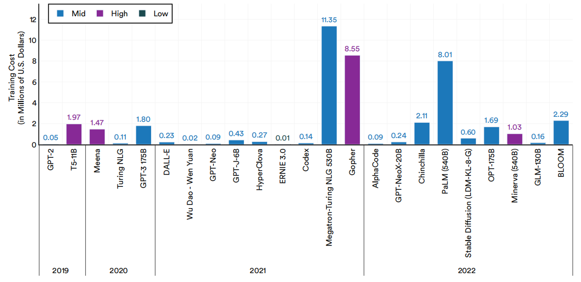 围绕大型语言和多模态模型的话语的一个特殊主题与它们的假设成本有关。尽管人工智能公司很少公开谈论训练成本,但人们普遍猜测,这些模型的训练成本为数百万美元,而且随着规模的扩大,成本将变得越来越昂贵。本小节介绍了一种新的分析,其中人工智能索引研究团队对各种大型语言和多模态模型的训练成本进行了估计(图1.2.17)。这些估计是基于模型的作者所披露的硬件和训练时间。在没有透露训练时间的情况下,我们根据硬件速度、训练计算和硬件利用率效率进行计算。考虑到估计值的可能可变性,我们用中、高或低的标签来限定每个估计值:中估计值被认为是中级估计值,高被认为是高估估计值,低被认为是低估估计值。在某些情况下,没有足够的数据来估计特定的大型语言和多模态模型的训练成本,因此这些模型在我们的分析中被省略了。