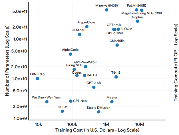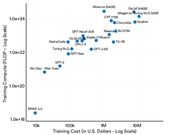 大型语言和多模态模型的成本与其规模之间也有明显的关系。如图1.2.18和1.2.19所示,具有更多参数的大型语言和多模态模型以及使用大量计算的训练往往更昂贵。