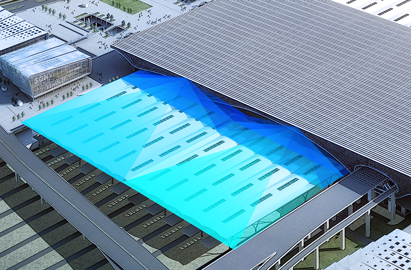 镭神智能自主研发了非接触固定式的激光雷达监控系统,通过将激光雷达布局在顶棚的侧上方,对风雨棚顶部进行全面监控,并根据测量的数据对棚顶进行实时建模,经过算法实时分析即可得知雨棚各部位的形变参数,当形变参数超过设置的阈值即发出报警信号,避免雨棚变形、损伤对行车和旅客安全的重大隐患。