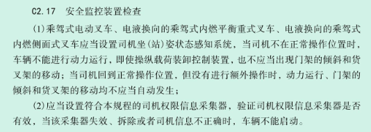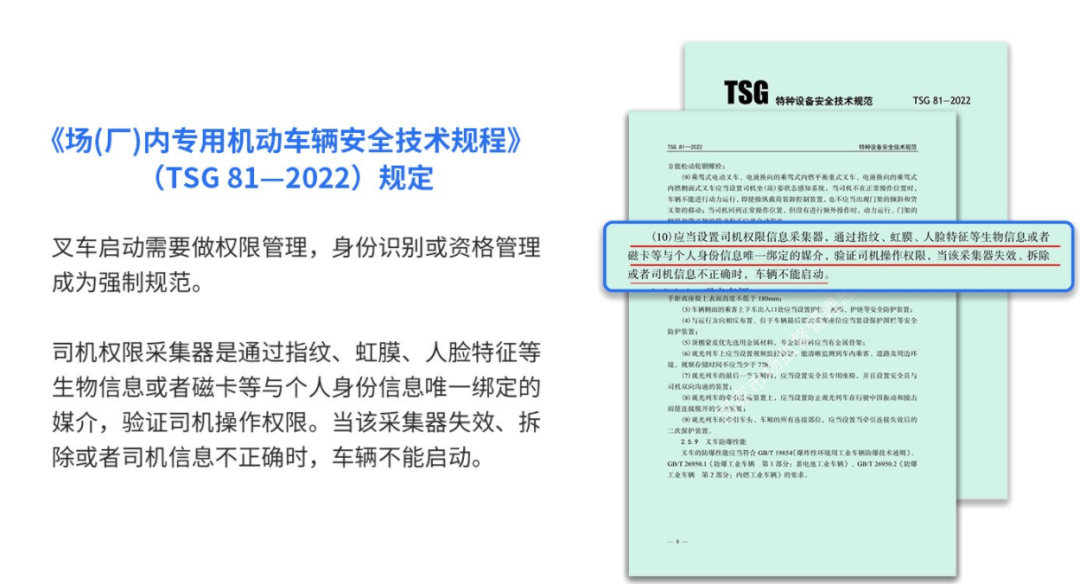 在安全保护与防护装置这一版块,就指出叉车须标配司机权限信息采集器,通过指纹、虹膜、人脸特征等生物信息或者磁卡等与个人身份信息唯一绑定,司机通过权限验证,才能启动车辆。