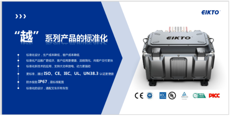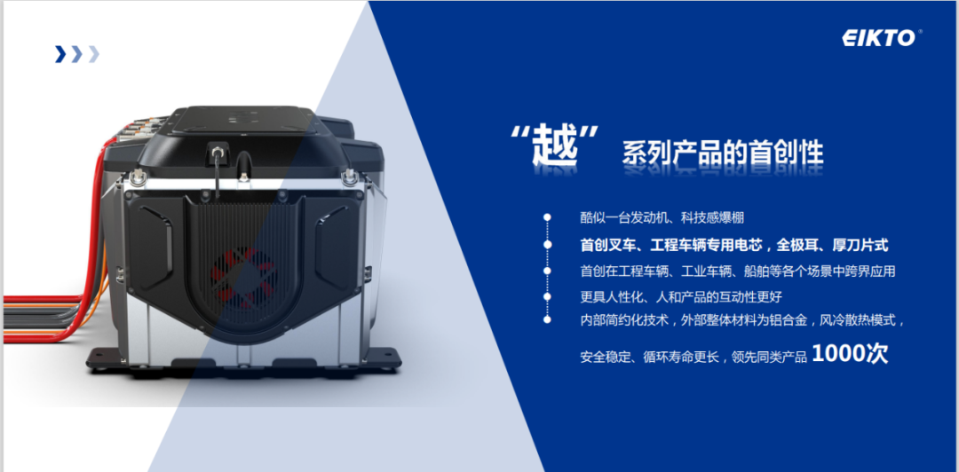 在发布会上,益佳通电池副总裁兼工业车辆事业部总经理周双女士指出,工业车辆现阶段的锂电特点是多品种、小批量和定制化,基于这样的特点导致生产复杂,成本高,交期长,认证费用高,售后维修复杂等等,面对行业痛点以及客户的心声,益佳通电池不间断的收集市场信息,整理分析电池数据,无数次的头脑风暴优化产品方案,反复的验证测试产品各种性能,终于经过2年多的卧薪尝胆推出了春秋五霸产品家族里的越系列产品。