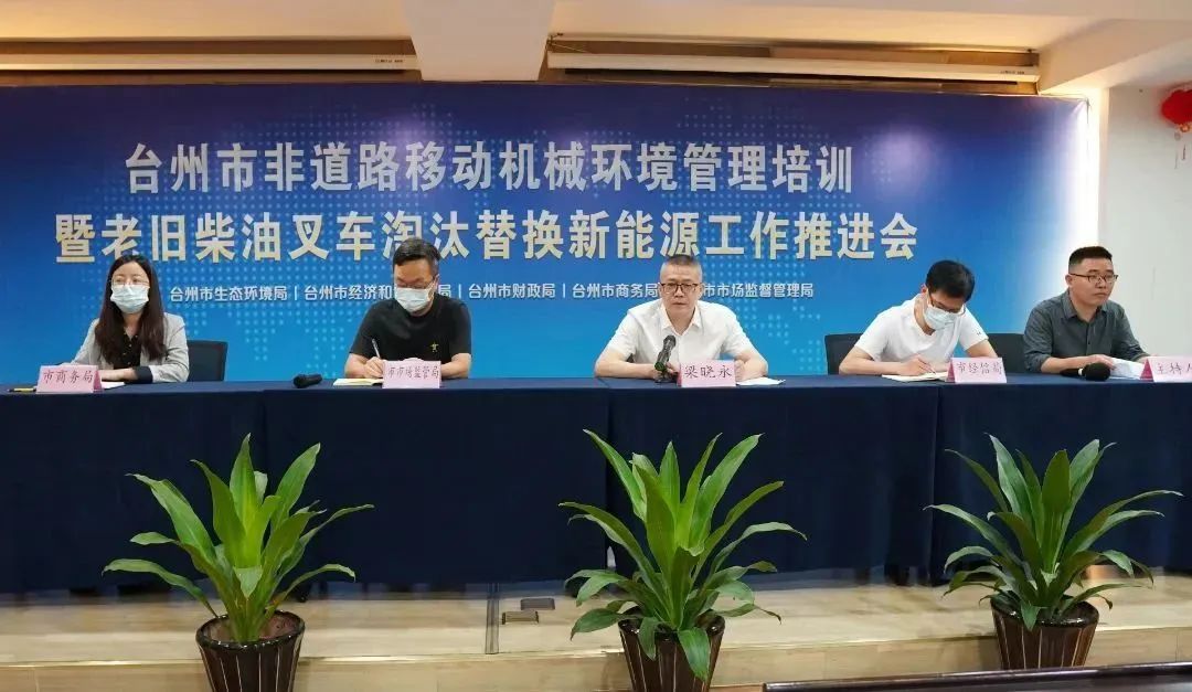 深入打好蓝天保卫战,持续改善环境空气质量,进一步规范非道路移动机械环境管理,提高所有人和使用人自我管理能力,推进老旧柴油叉车替换新能源工作进行,由市生态环境局、市经济和信息化局、市财政局、市商务局、市市场监督管理局等五部门共同举办的“台州市非道路移动机械环境管理培训暨老旧柴油叉车淘汰替换新能源工作推进会”于 2023 年 5 月21 日在浙江吉鑫祥叉车制造有限公司顺利召开。