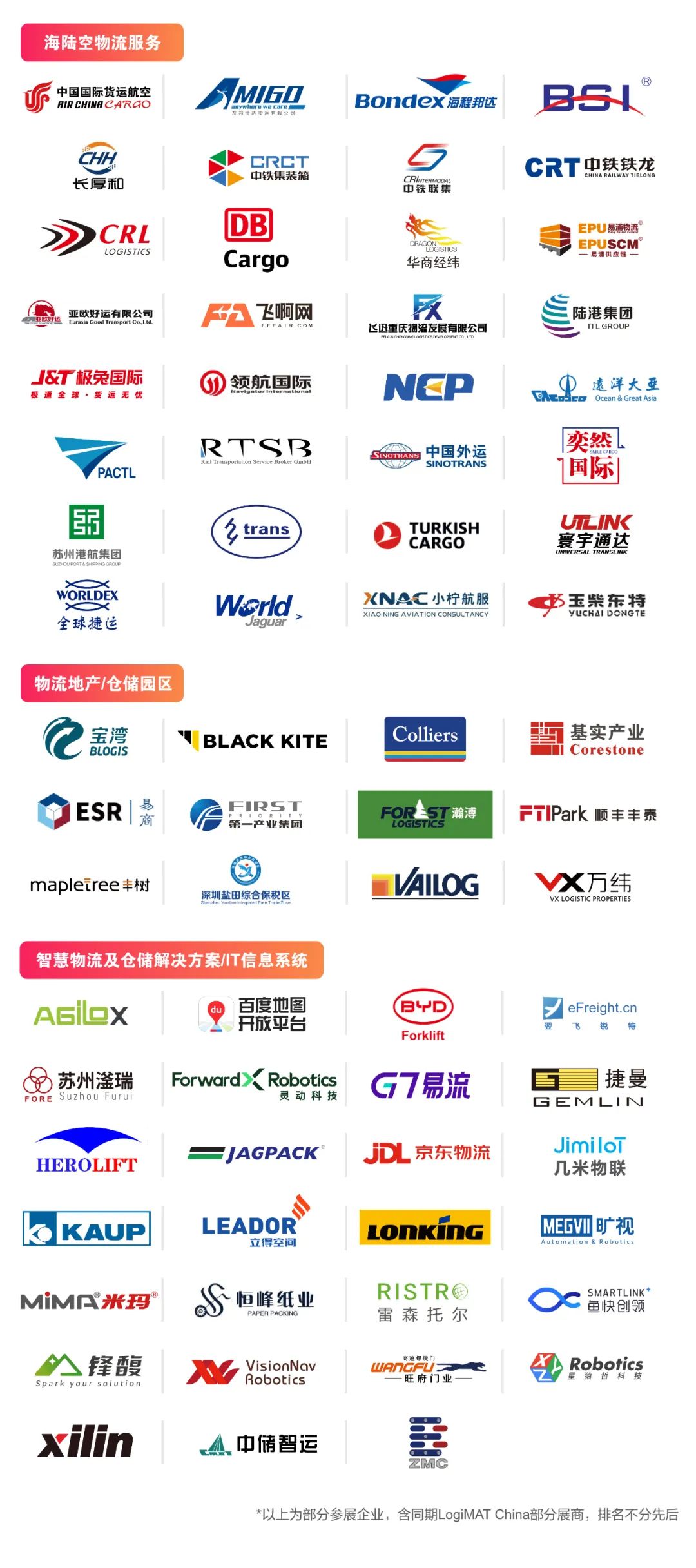亚洲物流双年展凭借近20载在中国物流行业的深耕与沉淀,吸引越来越多的物流老牌新贵加入,目前包括中国外运、中铁集装箱、中铁联集、中铁铁龙、寰宇通达、万纬、鸿运达、易商、京东物流、宝湾物流、丰树、维彧、RTSB、国货航、第一产业集团、中储南京、顺丰丰泰、德铁货运DB Cargo、百度地图、极兔物流、土耳其航空、几米物联、G7易流、顺丰冷运、肯尼亚星际航空、上海浦东机场等一大批知名物流商已报名参展,将在展会现场为业界演绎海陆空物流服务与多式联运创新解决方案、物流前沿科技的升级应用,助力行业从容应对“内外联通、安全高效、智慧绿色”大趋势下的挑战与机遇。