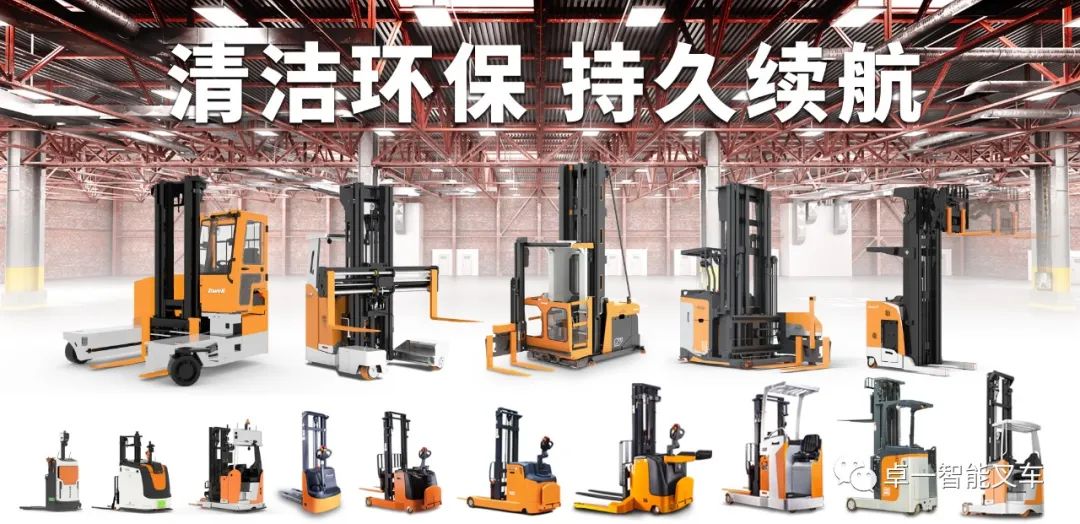 目前,卓一智能叉车已形成窄巷道叉车、前移式叉车、牵引车、堆垛车等系列电动产品矩阵,全面覆盖多行业的物流装备需求。客户可选配磷酸铁锂电池,以获得更高效环保、续航力更强的搬运方案。