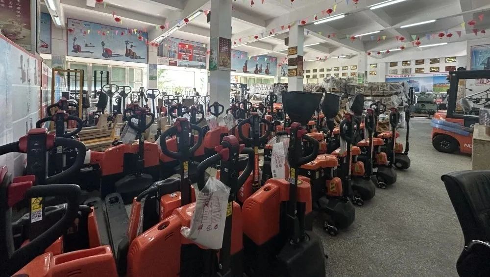 400平的门店,满满当当地停放着诺力凌动、EPT15W、PT20、天罡系列、PSE15-C等热门轻小型电动仓储车及Q系列、E系列四支点/三支点平衡重叉车。