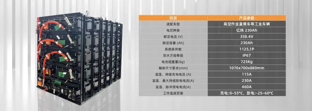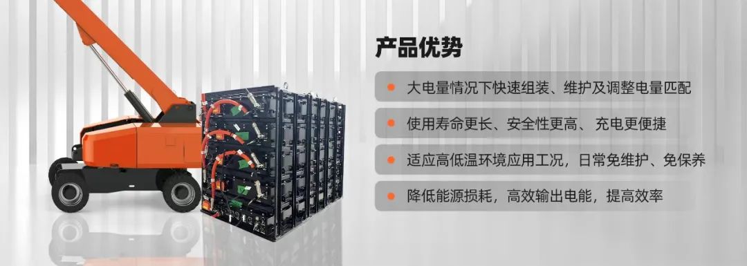 天能本次专为模块化臂式高空作业平台车定制的358V230Ah车规级标准箱式高压动力锂电池包,一经推出备受市场好评,其产品优势也在众多项目中得到了验证。