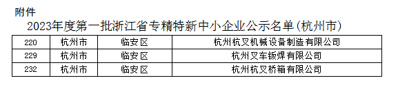 为深入贯彻党中央国务院和省委省政府培育专精特新的决策部署,根据工业和信息化部《优质中小企业梯度培育管理暂行办法》(工信部企业〔2022〕63号)和《浙江省经济和信息化厅关于印发浙江省优质中小企业梯度培育管理实施细则(暂行)的通知》(浙经信企业〔2022〕197号)等要求,浙江省经济和信息化厅组织开展2023年度第一批省专精特新中小企业认定工作,引导中小企业走专业化、精细化、特色化、新颖化发展之路,现已完成相关审核,通过官方信息平台公示了“2023年度第一批浙江省专精特新中小企业公示名单(杭州市)”,杭叉集团股份有限公司(以下简称“公司”)的子公司杭州杭叉机械设备制造有限公司、杭州叉车钣焊有限公司、杭州杭叉桥箱有限公司三家公司被列为2023年度第一批浙江省专精特新中小企业。