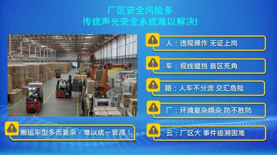 传统厂区作业环境复杂,安全风险多,人、车、路多方面的问题随处可见,防不胜防。厂区搬运车型多而复杂,难以统一管理,发生安全事故也较难追溯。总之就是面临:事前无预警,事中无管控,事后难取证等困境,安全隐患亟待解决。