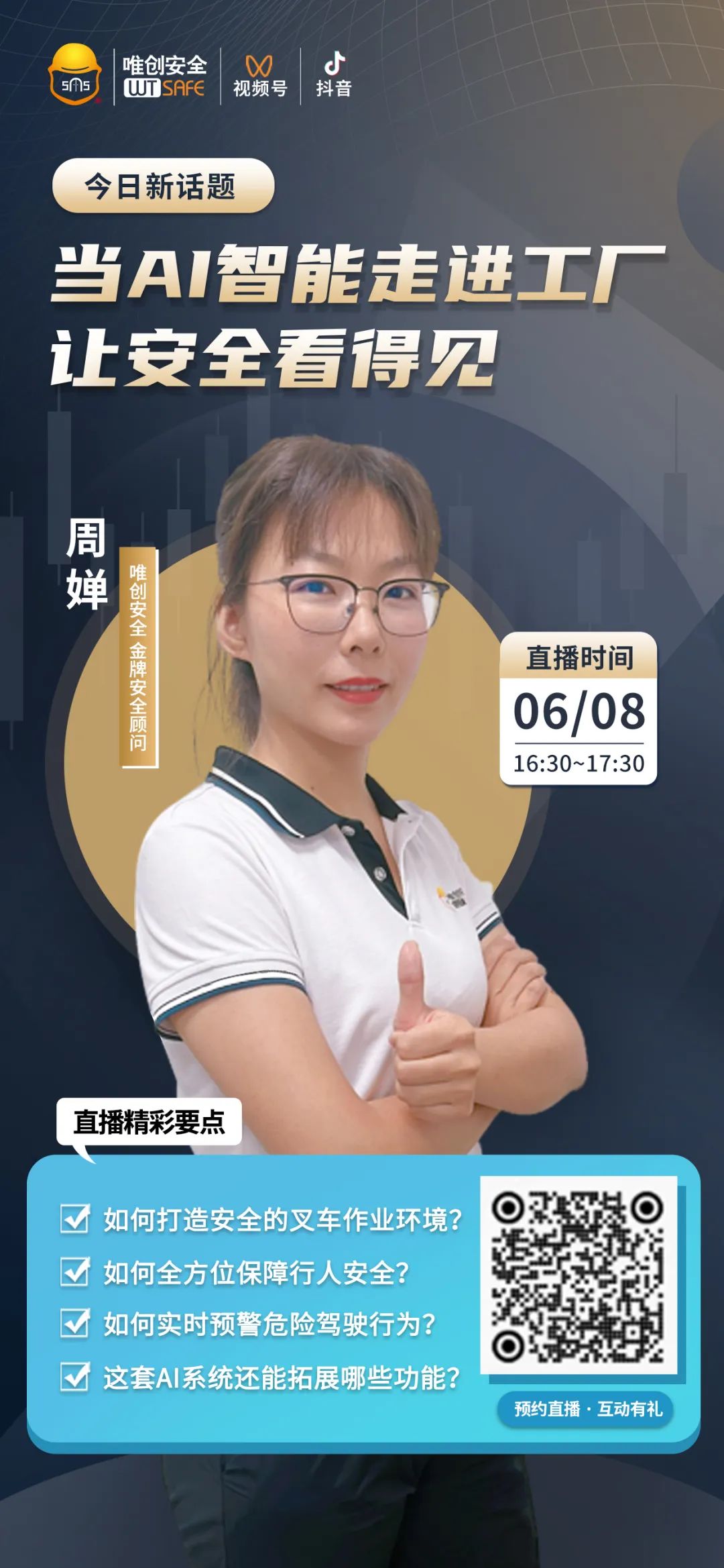 本周四下午4点半,唯创安全直播间准时开播,金牌安全顾问-周婵将为大家详细介绍SF-421叉车AI安全监控预警系统,看看这套被众多大型企业采纳的AI智能系统,能给企业带来哪些安全价值?