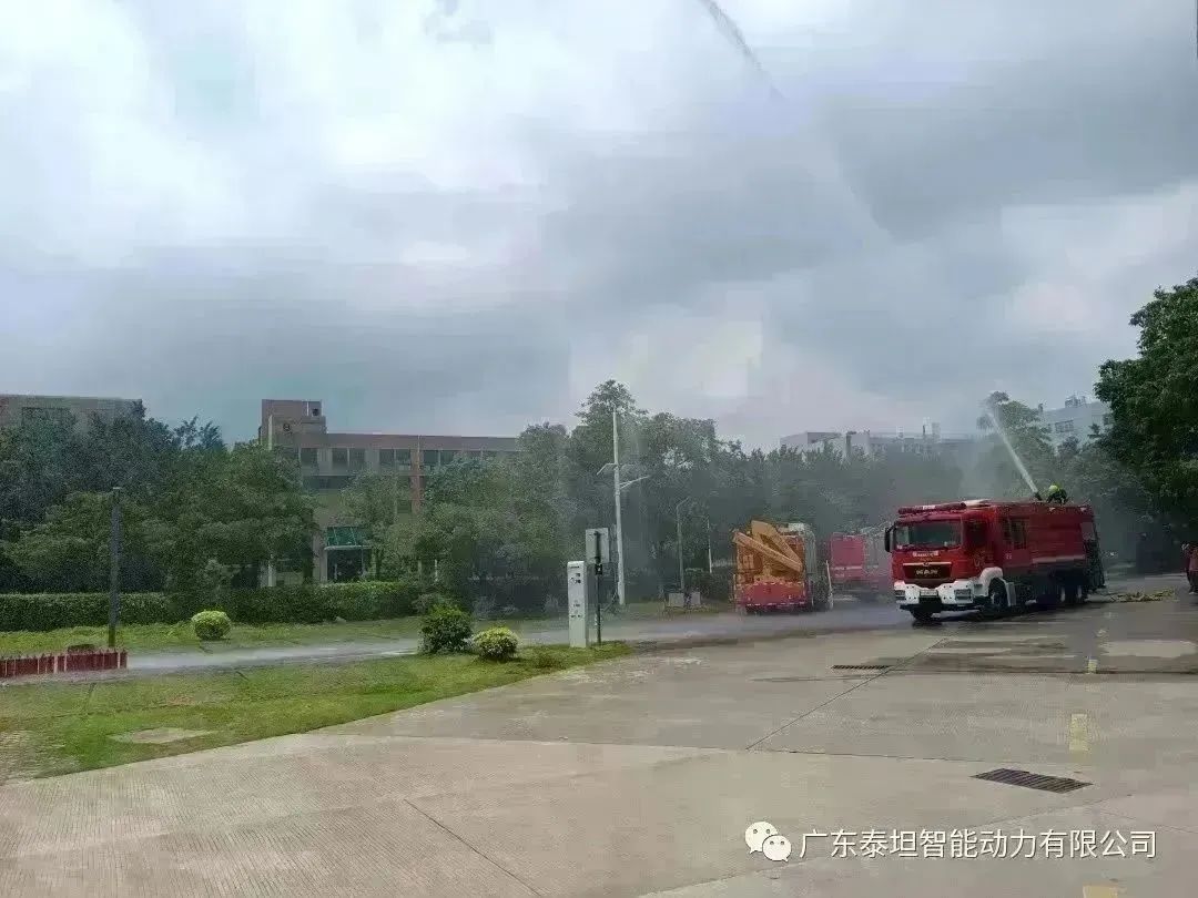 消防车在模拟高压喷水灭火。