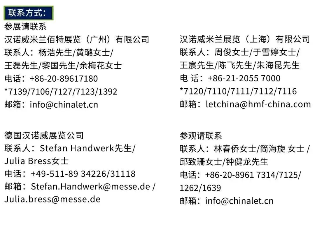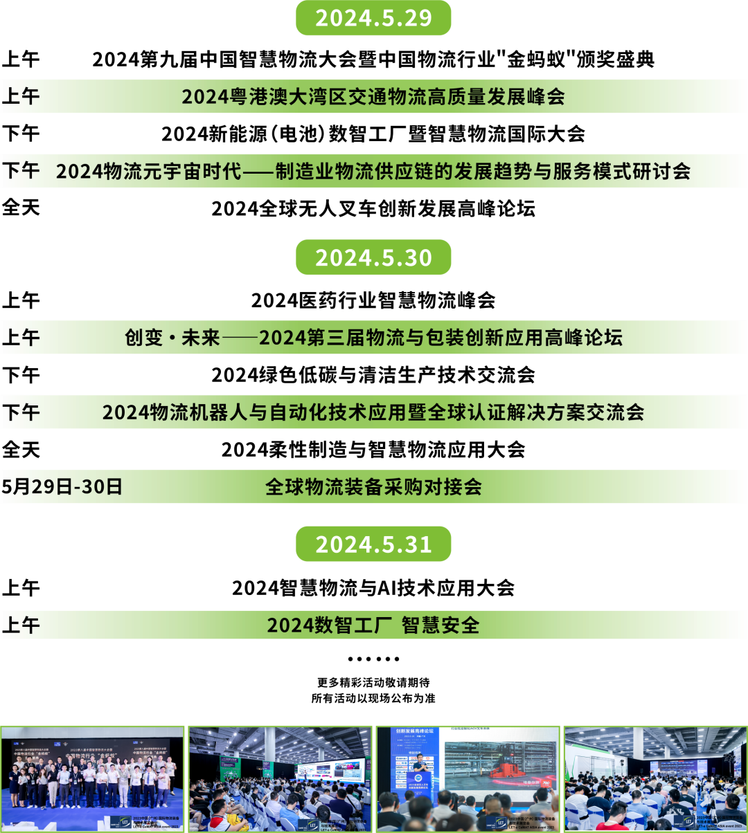 LET 2024 黄金展位火爆抢订中 抢抓市场新机遇 开拓发展新路径 2024.5.29-31共同引领新一代 数智工厂·智慧物流 技术变革浪潮 2024中国(广州)国际物流装备与技术展览会 2024.5.29-31 广州·广交会展馆D区 展会简介 2024中国(广州)国际物流装备与技术展览会以“数智工厂·智慧物流”为主题,聚焦产线物流自动化、仓储物流智能化、供应链物流、数智工厂与智能制造等领域,紧跟智能化与数字化发展态势,借“粤港澳大湾区”、“海南自贸港”、“一带一路”、“RCEP”的政策东风,深度挖掘海内外需求,布局全球物流产业市场,为智慧工厂、生产物流、仓储物流、配送物流、供应链、企业物联网提供高质量的展览、交流、合作一站式平台,为展商带来全产业链的高质量买家资源,助力抢占粤港澳大湾区、华南、“一带一路”、东盟等新兴市场火热商机。 *上届展会盛况 展 品 范 围 汇聚先进装备技术 聚焦数智物流新变革 同 期 展 会 五大专题展联袂呈现 全产业链融合促高质量发展 往届知名展商 物流业内翘楚齐聚 引领数智物流新风潮 向上滑动阅览 仓储物流的完整系统和仓储车间设备 大福、德马泰克、胜斐迩、瑞仕格、范德兰德、卡迪斯、仲西、昆船智能、今天国际、兰剑智能、科捷智能、中科微至、旷视、安吉智能、中鼎、仲秋、华章、科陆、井松智能、台朔、江苏高科、顺力智能、智库智能、智芯科技、玫德、亨通、蓝天智能、舜储智能、赛斐迩、博柯莱、隆链、磅旗、慧仓、胜模、Anwood、华恒、高科锐志、东杰智能、福莱瑞达、牛眼、胜沃智能、易库、远荣、音锋、米亚斯、韬谱、Intelligrated、SFA、住友、鹏远、欧标、江锐、六维、史必诺、柯尼科、迈客等 物料搬运和设备 合力、杭叉、林德、永恒力、科朗、海斯特、三菱、力至优、台励福、现代、斗山、三一、柳工、龙工、中力、诺力、如意、比亚迪、徐工、搬易通、吉鑫祥、先锋、牛力、大隆、乐吉腾、江淮、厦工、凯傲宝骊、大连、储力、华和、佳力、迈普顿、宏润、海迈克、玛西尔、鸥琵凯、骏鸿、中燕、科力、微力、金葛、迪鼎、雷腾、舜工、中轩莱力、利工、卡斯卡特、靠普、博索尼、益佳通、环信、法阿姆、宁德时代、研祥智能等 输送设备及其配件 Intralox、德马、锋馥、新北洋、伟梯施、友力智能、金峰物流、昌恒智能、艮业、康奋威、恒链科技、衣拿智能、华南新海、泽业、联领、应杰科技、保德、晶测、宏江、诺德、锵泽、汇千、赫众、威派腾达、达菲、赛弗、莫安迪、闳宽、佑明芯、中顺、盛行者、晟雄、胜牌、斯巴克斯、曼巴、新琦、一晋、中大力德、纽氏达特、杰牌、万鑫精工等 内部物流系统与软件 康耐视、西克、Turck、IFM、斑马、基恩士、研祥金码、爱鸥、佐藤、华为、联通、星猿哲、瑞意博、南软、魔与方、碧彩、英特迩、高通、上尚、南德、灵耀数智、极动、德克威尔、康利达、维感、零点、椿藤、渐近线、速威、龙图、霓廊、大深、迈德等 物流机器人&AGV ABB、KUKA、MAX、科尔摩根、海康、极智嘉、海柔创新、快仓、斯坦德、新松、嘉腾、机枓、华睿、牧星、劢微、国自、迦智、宇锋、未来机器人、迈睿、井松机器人、科钛、灵动、立镖、塔斯克、海豚之星、智千智能、驭势、木牛流马、优艾智合、寻迹智行、欧铠、坤力、驿享智联、技田、井智高科、井源、驷源、海通、壹悟、法勒、镭神、湘聚、凤凰动力、沛远智能、科聪、东佑达、蓝海、兴颂、易行、万集、北醒、傲视智绘、步科、富兴、力策、科力、莱恩、因泰立、睿芯行、松蒙、金陵、奥斯特、中立、卓蓝、同毅、迈测等 自动化包装设备及材料 永创智能、中亚、元旭、固尔琦、万尔芯、晓辉、众聚、双马智能、恒盛力、力辰、小黄蜂、劲翔、乐派、大合智能、汉尔得、柯西、力卡、鹏威、炜田、炜鸿、道远、胜豪、比帝富、力库、赛普、金都、新美、箱箱、志光、东拓、吉田、华南、小蚁托盘、富事达、良才、汇久丰、振基木器、精端、永盛昌、卓成、精玖、天健包装、宁士、招商路凯、派王、翔鑫、杰华、守肯、恒信达、欧之可、仁晖、俊逸、双瑞、晨海、派卫格、普拉托、昱希、东波、正基、捷运环保等 *往届部分参展商,排名不分先后 上届VIP参观团 核心买家集结LET 构建供需强链接
