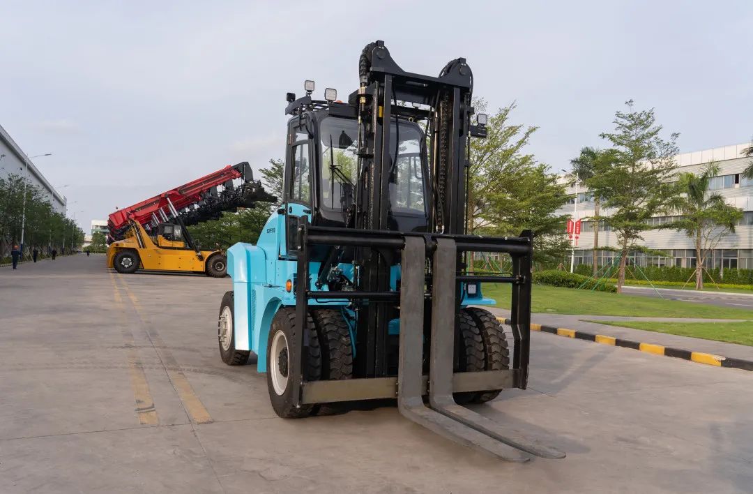 SCPE100纯电动叉车额定载荷10t,可根据客户需求配置90kwh、114kwh不同的容量电池,续航时间可达8h,满充时间≤1h。