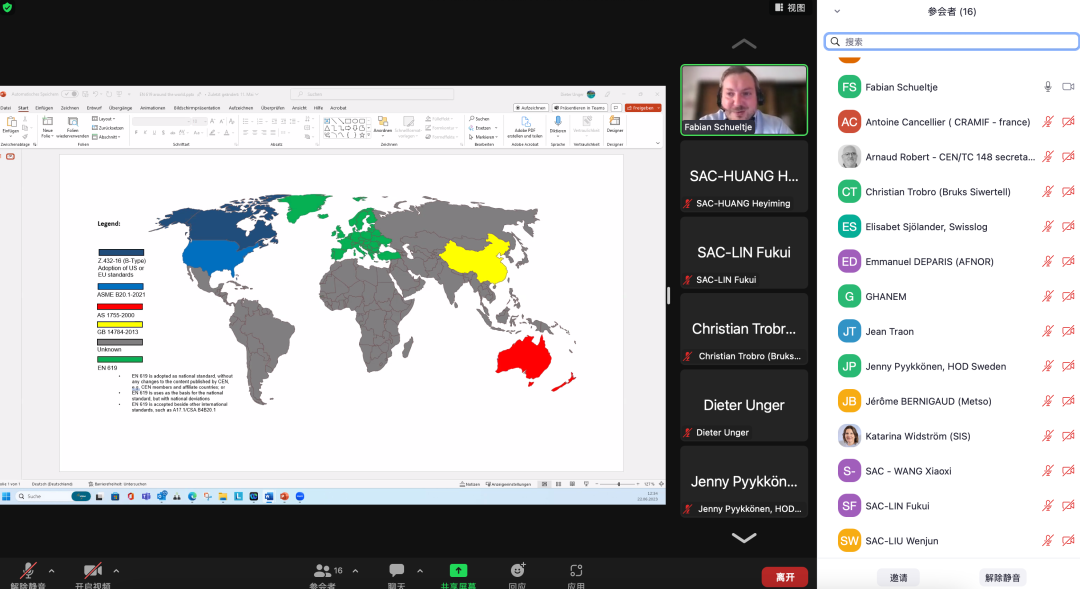 2023年6月22日,国际标准化组织连续机械搬运设备技术委员会(ISO/TC101)国际视频会议成功召开。来自中国、德国、法国、英国、瑞典、意大利等6个国家的16名代表参加了会议。北京起重运输机械设计研究院有限公司(以下简称“北起院”)作为ISO/TC101国内技术对口单位,组织行业的4名专家组成中国代表团代表国家标准化管理委员会(SAC)参加了会议。代表团团长由北起院标准工作部林夫奎部长担任。